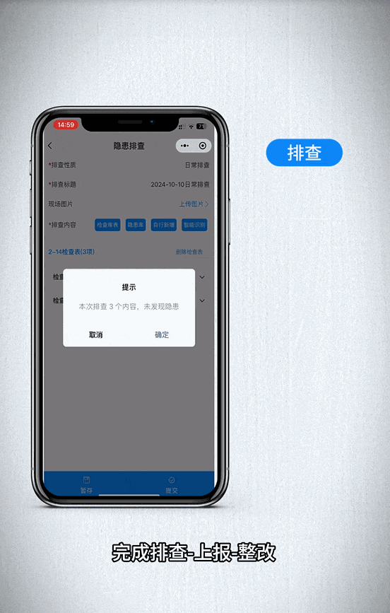 现场隐患图片拍一拍,AI帮你一键识别,对应图片上的隐患点、检查依据、整改建议一下子全部出来了,提供全面、准确、有理有据、专业的整改措施,自动形成隐患排查记录及报告。