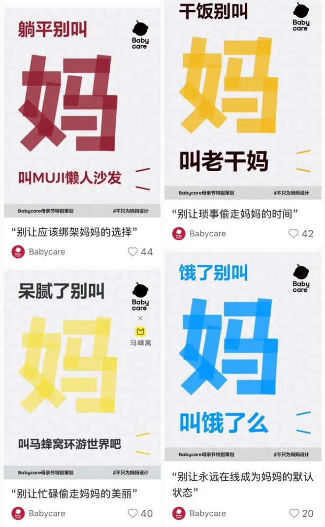 Babycare今年的母亲节策划,则站在母职压力大的女性痛点上,喊出“不只为妈妈设计”的口号,旨在从产品设计出发,让家庭成员都参与到育婴中来,让妈妈得到解放。看得出来,Babycare此次的母亲节营销在概念上花费了不少心思。除了广告短片外,一系列“搬家别叫妈,叫货拉拉”“饿了别叫妈,叫饿了么”等大字报让人应接不暇。