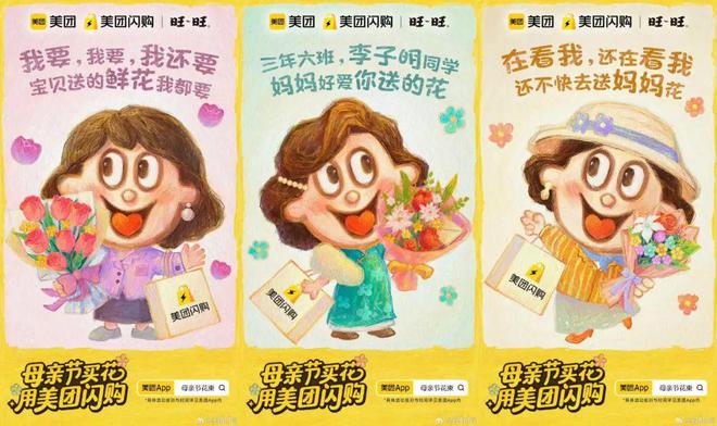 今年母亲节,美团闪购就和旺仔搞起了联名,让旺仔妈妈收到了美团闪购送的花。这一联动不光唤起网友对“李子明同学”“我要我要我还要”一系列经典广告的群体记忆,更带动了网友进行二创P图,给众多知名IP里的妈妈都送了花,与用户进行了一次轻松幽默的传播互动。