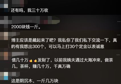 但是有些网友不相信,他们甚至怀疑是博主自己藏起来,然后假装木头被海水冲走了!然后网友们开始进行报价,有说一斤2000元的,有说一斤几万块的,还有人想要出30万收购,甚至有个人喊了300万。虽然我觉得他们很多都是瞎起哄的,但也说明阴沉木给人的印象就是贵。