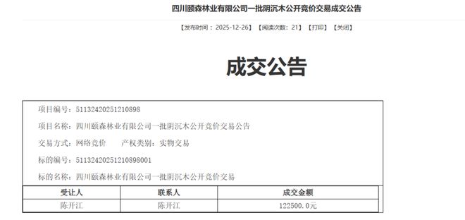 例如在2025年底,四川仪陇县一批阴沉木通过公开竞价,以12.25万元成交。